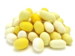 黄色や黄緑色を持つ品種の乾繭です。糸取りをすることができます。中に蛹が入っています。